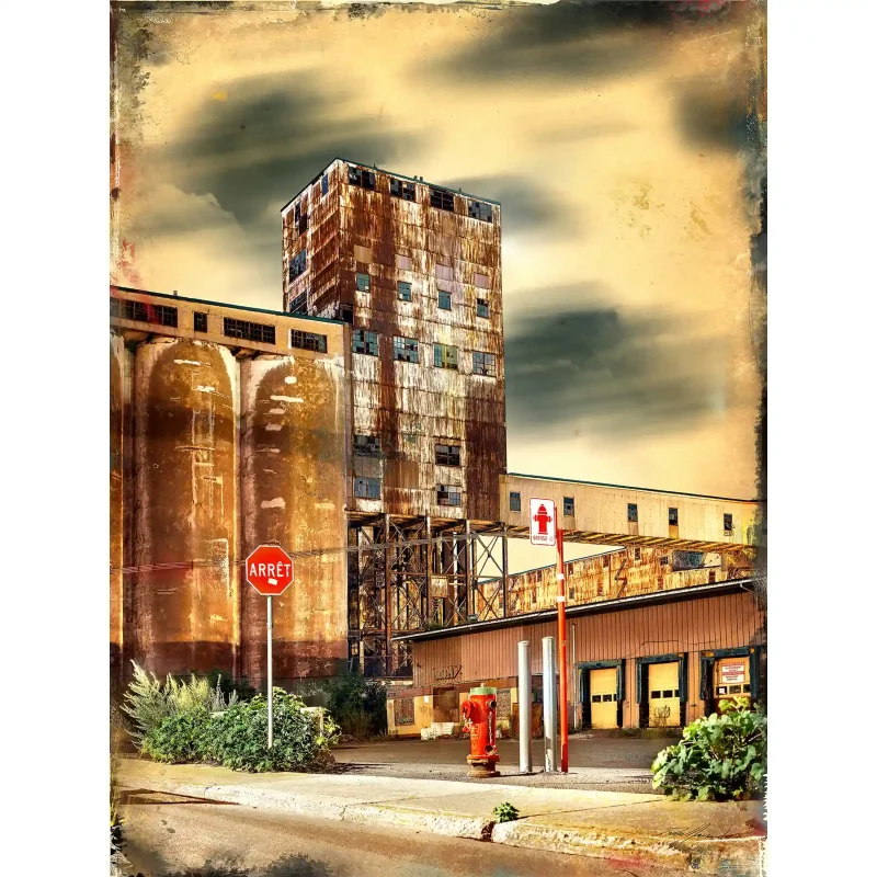Surplombée par l’élévateur à grain #5, la cour abandonnée de la Clipper Ship Supply donne le ton. Je m’installe en pleine voie carrossable, confiant de l’opportunité qui me permet de maximiser l’angle souhaité. Les secondes défilent, accompagnant mes expositions longues sur trépied.