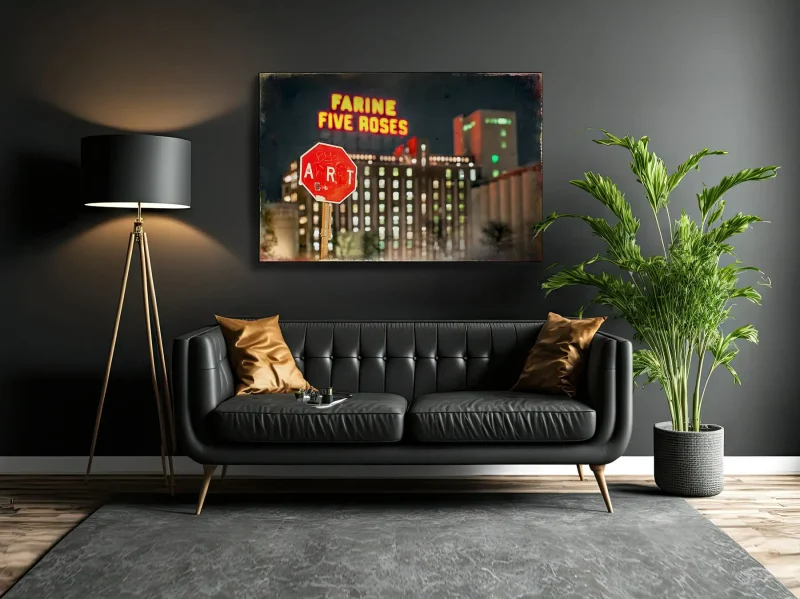 Je suis posté là, trépied campé sur l’asphalte un peu trop craqué, l’œil rivé au viseur, le souffle suspendu. Le ciel est sec, l’air est froid. Et pourtant… la chaleur est là, quelque part entre la lueur rouge du « FARINE FIVE ROSES » et cette pancarte arrêt qui a décidé, ce soir-là, d’arrêter autre chose : le banal. Trois lettres, un geste — A R T.
