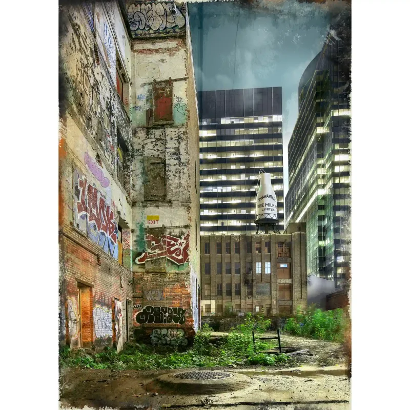 Technique mixte : photographies nocturnes, interventions numériques, impression jet d’encre sur canevas, peinture aérosol et vernis. L’édition originale est limitée à 25 exemplaires (tous formats confondus) et chacune des oeuvres de la série est légèrement différente des autres. Pour plus de détails: [email protected].