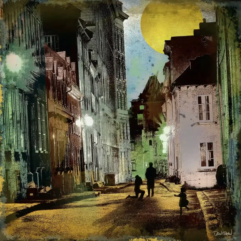 Dans la pénombre de la rue Hébert, une scène de règlement de compte avec un enfant en action se déroule sous nos yeux. On se demande si l’enfant réussira à toucher le coeur du gangster… Une scène déchirante autant par le contexte véhiculé que par l’ambiance sombre et dramatique qui est vécue et ressentie dans cette toile.