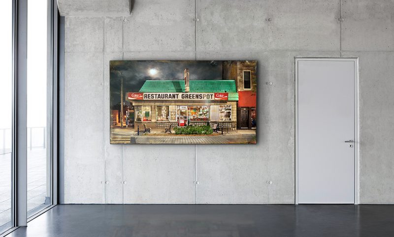 M’apprêtant à déclencher mes premières prises, l’esprit en partie affairé à la technique, je remarque un mouvement furtif du coin de l’œil. Intrigué, je lève la tête et j’aperçois une silhouette éthérée se faufilant derrière le comptoir. Bien qu’il ne soit plus ouvert 24 heures sur 24 comme autrefois, c’est bien à croire que Greenspot ne dort jamais! Fin de quart de travail? Préparation du suivant?