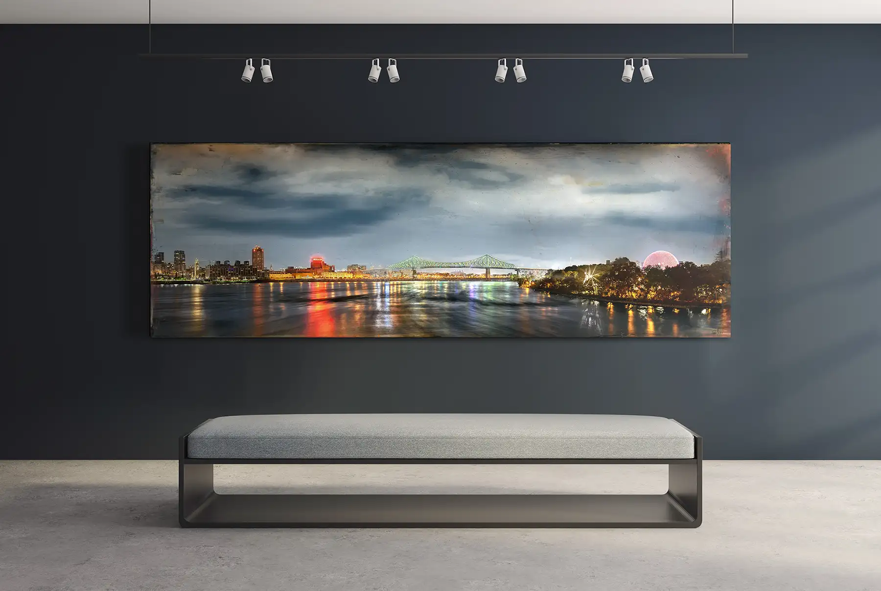 Version écourtée de l’œuvre MTL VI, ici la partie de droite dite « EST ». Bien que moins allongée, on y compte tout de même un nombre important d’icônes montréalaises, entre autres, l’ancienne tour de Radio-Canada, la brasserie Molson, le pont Jacques-Cartier, la Biosphère, etc…. Plutôt qu’un ratio de 1 pour 5, cette proposition offre un ratio de 1 pour 3. Voir ci-haut dans le menu déroulant, les différents formats disponibles.