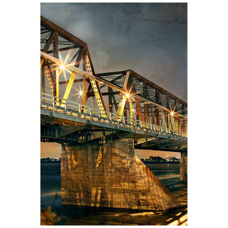 Difficile bête à capturer ou enfin, à mettre en valeur! Premier pont à traverser le fleuve St-Laurent (inauguré en 1860! – pensez-y, c’est une structure de plus de 162 ans qui encore aujourd’hui sert quotidiennement pour la traversée d’un grand nombre de véhicules)…